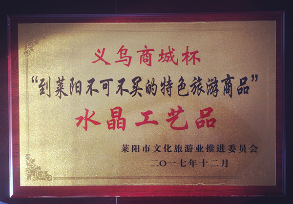我公司生产的水晶工艺品获得莱阳义乌商城杯“到莱阳不可不买的特色旅游商品”称号